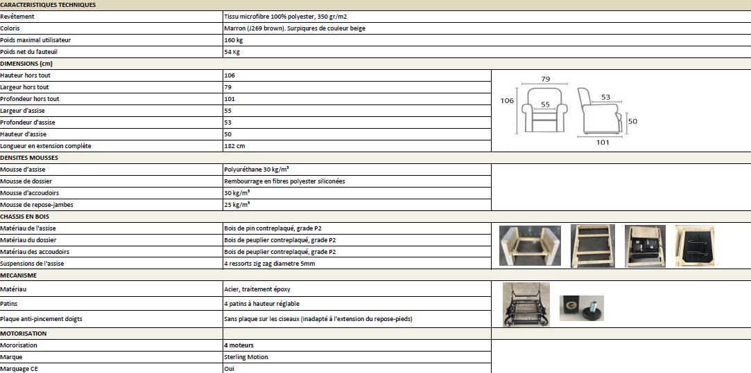 Fauteuil releveur offrant un confort et un maintien optimal. Patins à hauteur réglable. Structure en bois de pin contreplaqué. Densité de mousse assise 30 kg/m³, accoudoirs 30 kg/m³ et repose-jambes 25 kg/m³. Revêtement en microfibre 100 % polyester. Télécommande filaire, récepteur USB.