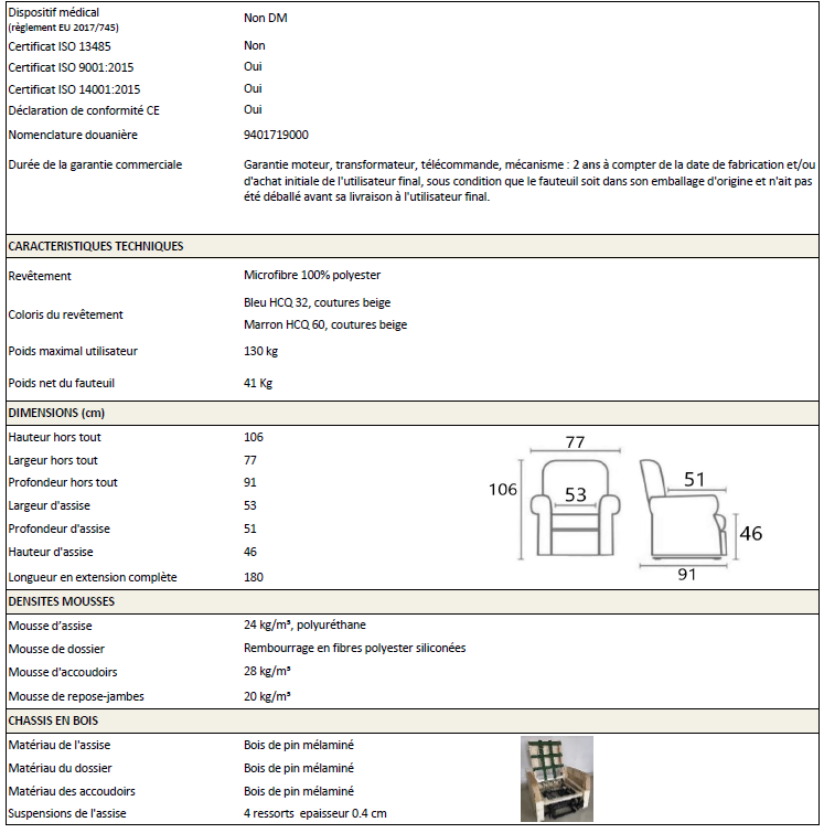 Fauteuil releveur 2 moteurs en revêtement microfibre 100 % polyester.