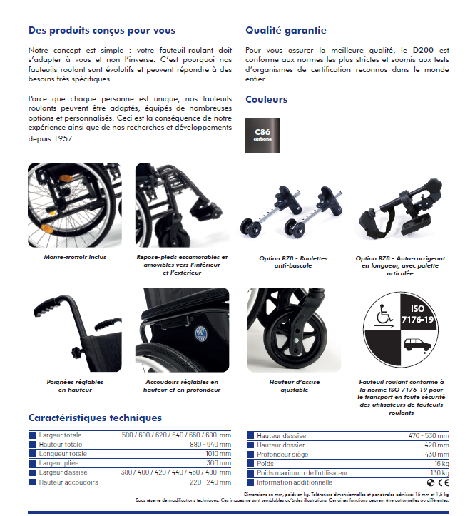 Le D200 est un fauteuil roulant manuel léger et fonctionnel en aluminium