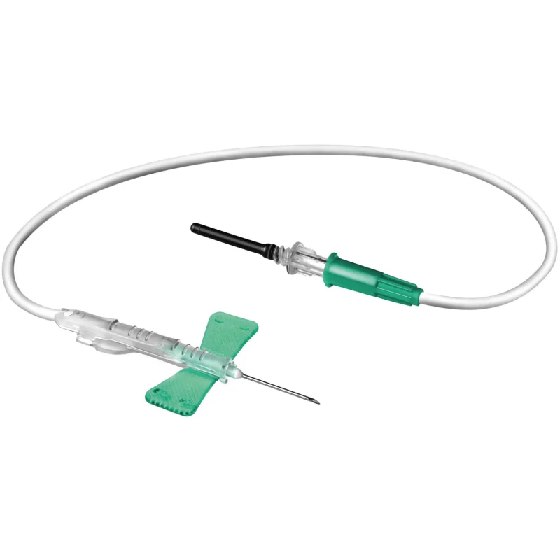 Aiguille à ailettes avec système de sécurité et adaptateur luer pré-assemblé, stérile, à usage unique, apyrogène, atoxique, pour effectuer des prélèvements sanguins multiples pendant l’exécution d’un accès veineux périphérique unique.